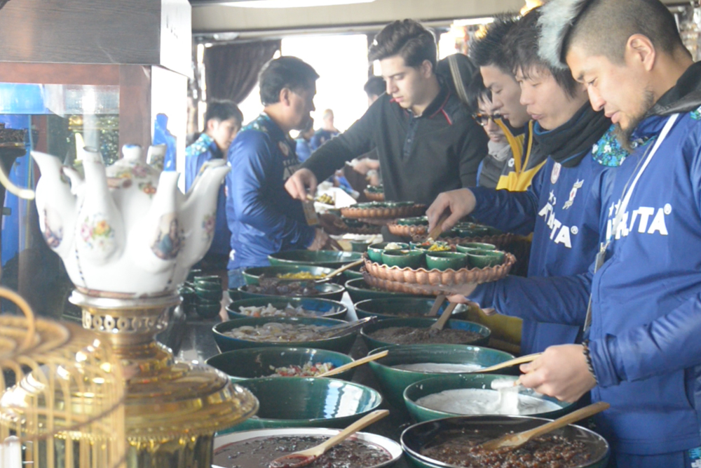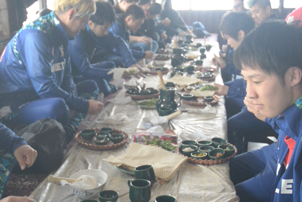 球舞のパフォーマンスを披露し、日本チームの助っ人カザフスタン人のカリームが歌を歌ったり、日本から持って行ったお土産を渡しました。