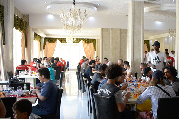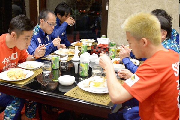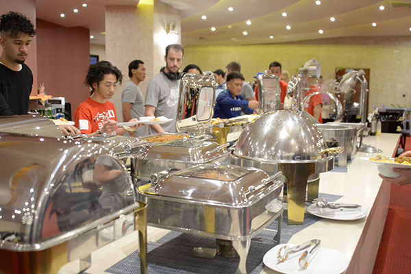 21時よりホテルレストランでビュッフェ式の夕飯が提供され、各国チームと一緒に食事となりました。